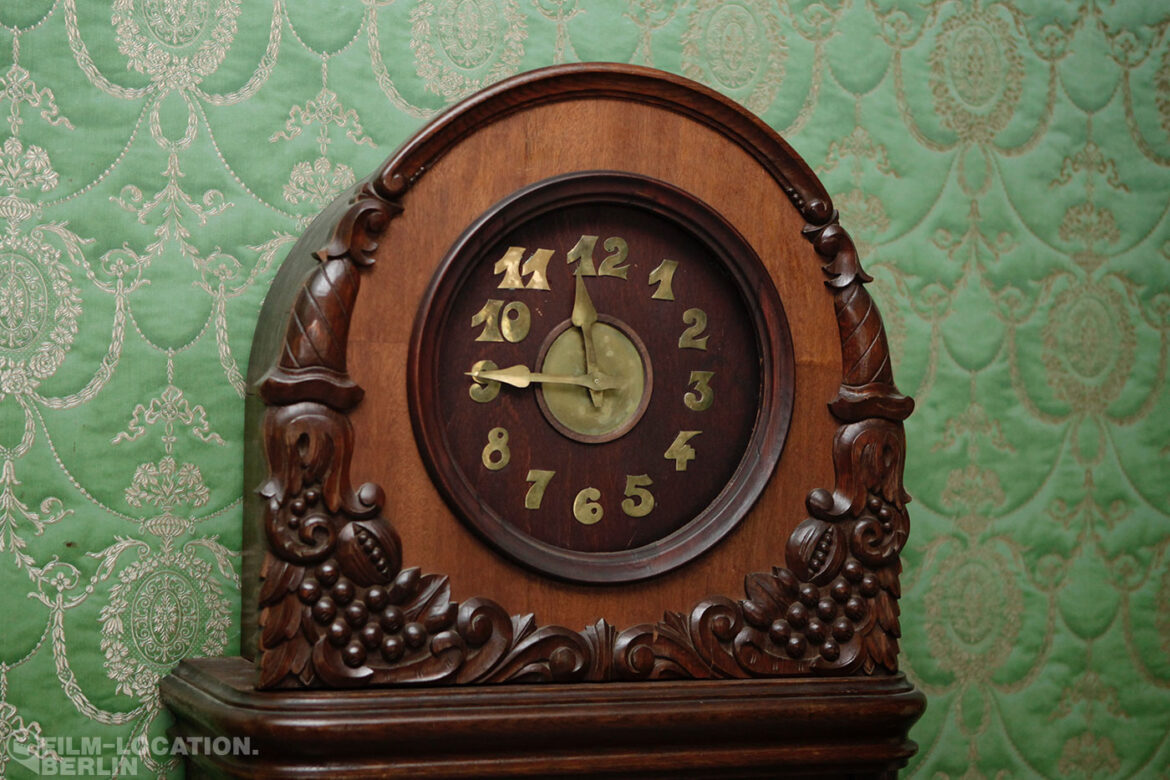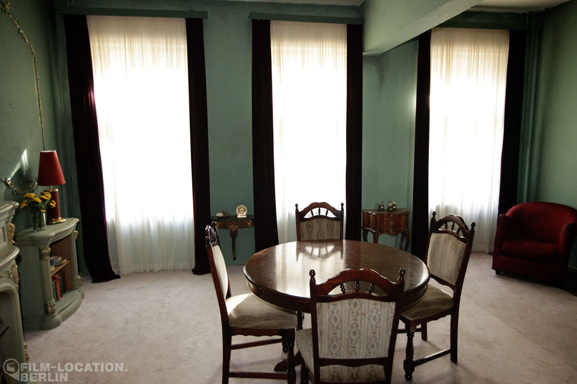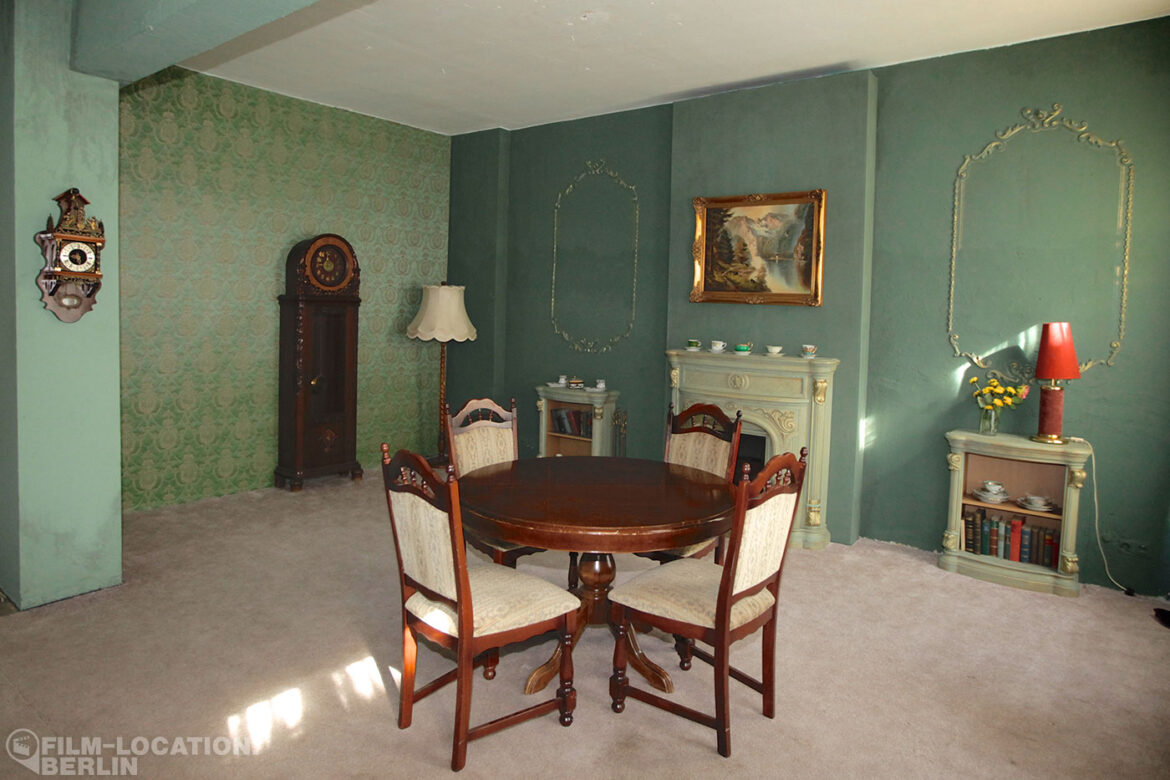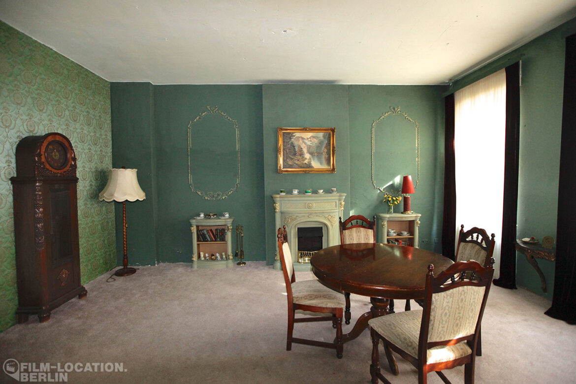 The Baroque-style fireplace room is decorated in various shades of green and is adorned with an ornate fireplace and artistic stucco. In the center of the room is a dining table with four chairs. On the opposite wall, there is a dark wood secretary and a red reading chair. Cream-colored curtains and burgundy velvet drapes add color accents and complement the stylish furnishings.