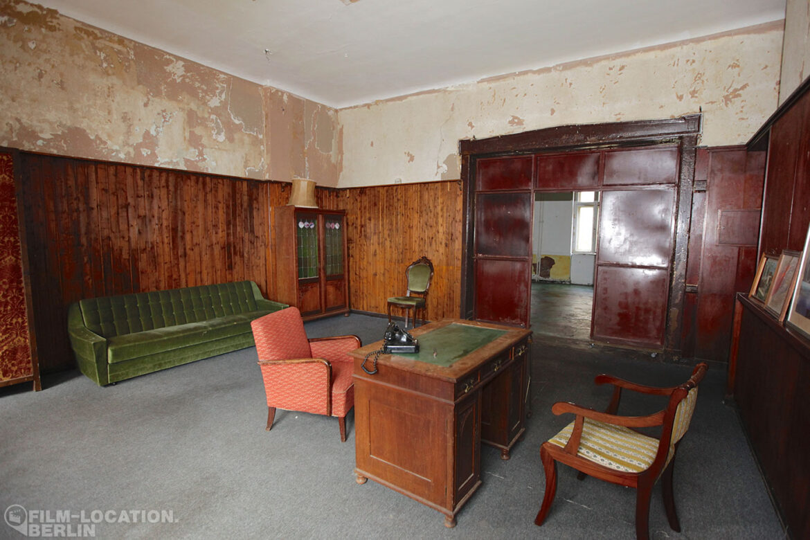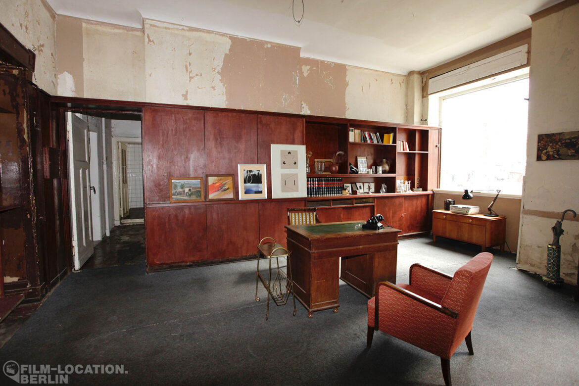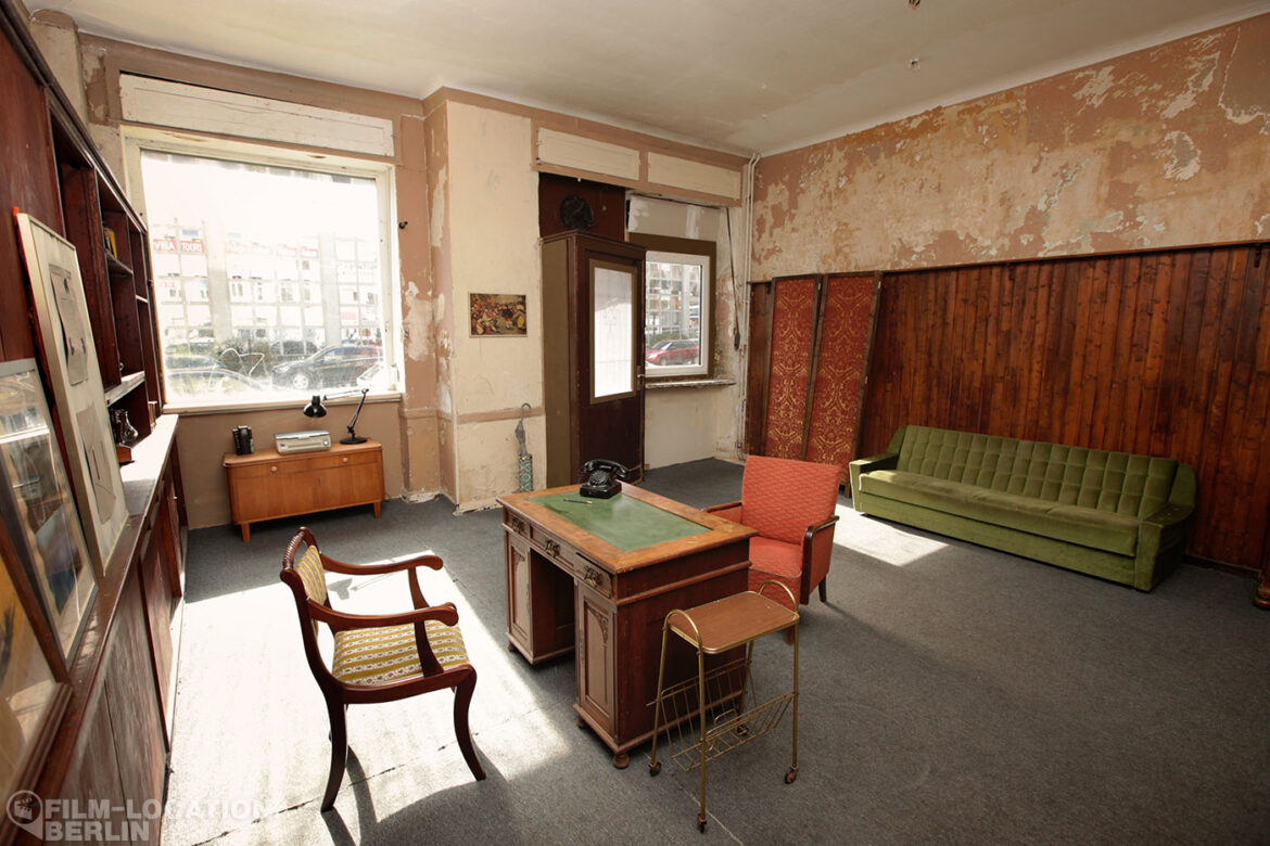 The former pub on Lichtenberger Herzbergstraße can be thematically transformed into an old men’s office, a (psycho)therapist’s office, or a law firm. The dark wood paneling exudes timelessness. A basic setup with matching furniture and small props is available. The view from the window faces Herzbergstraße.