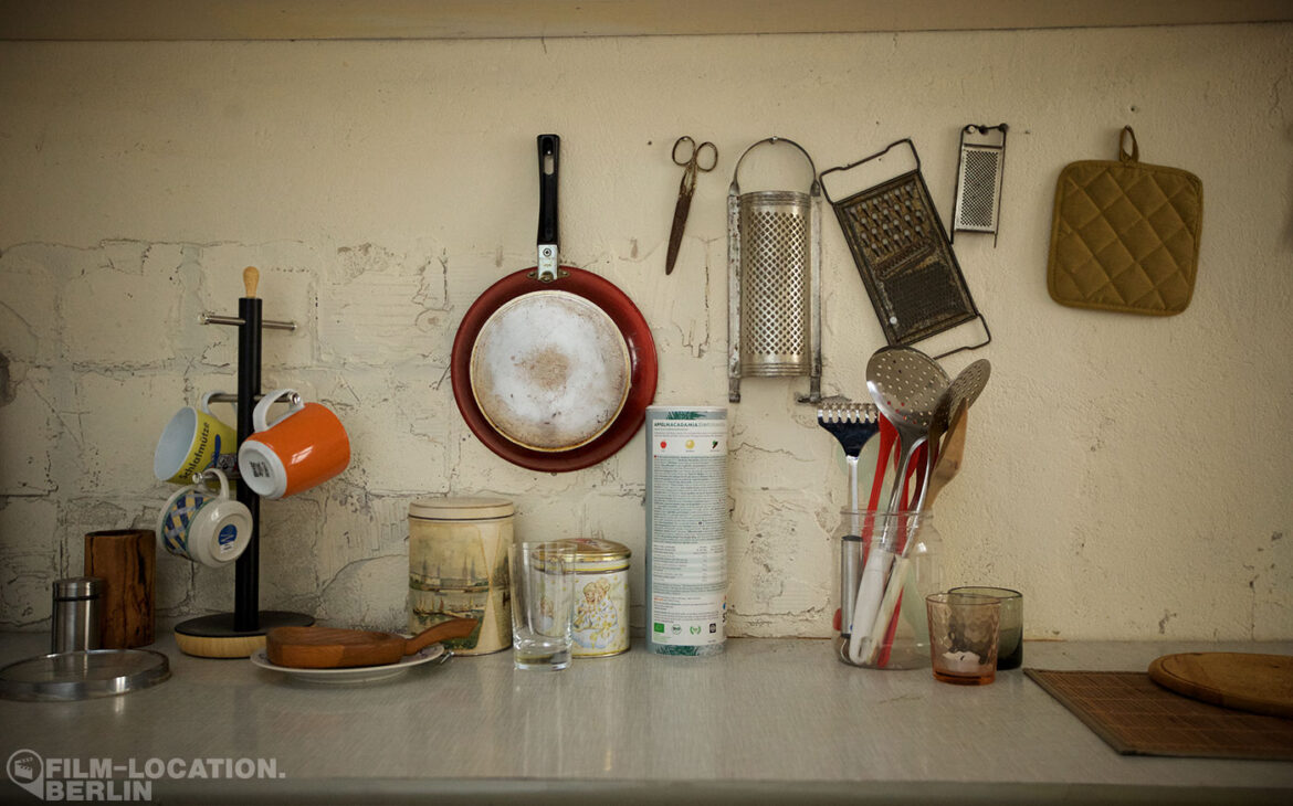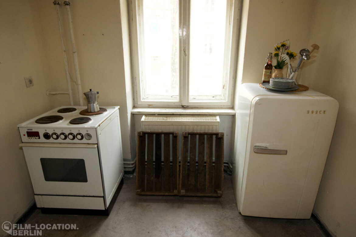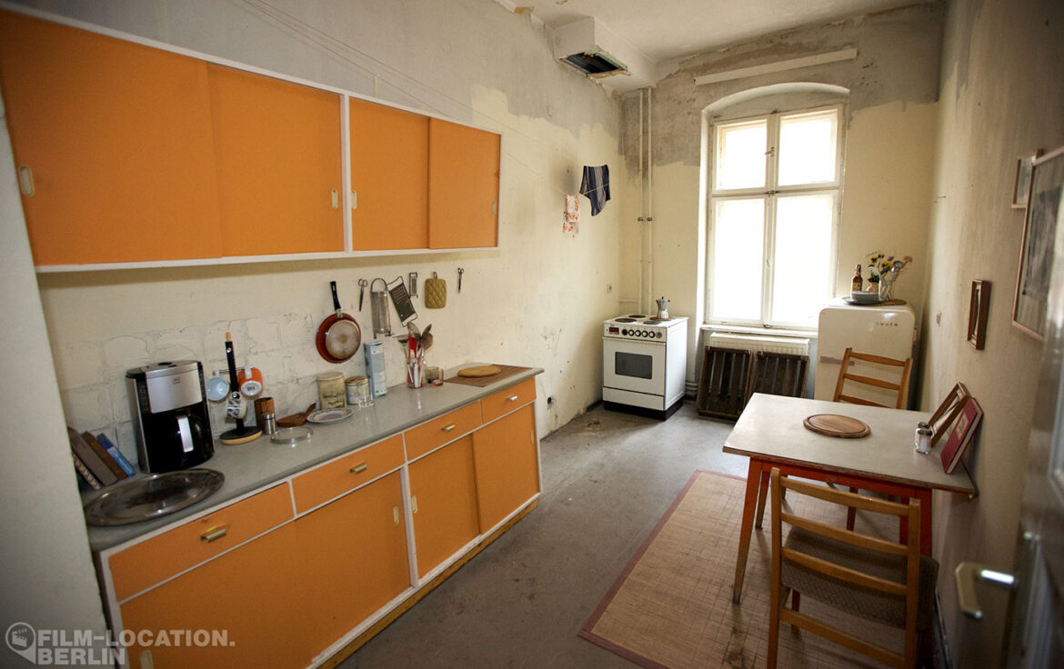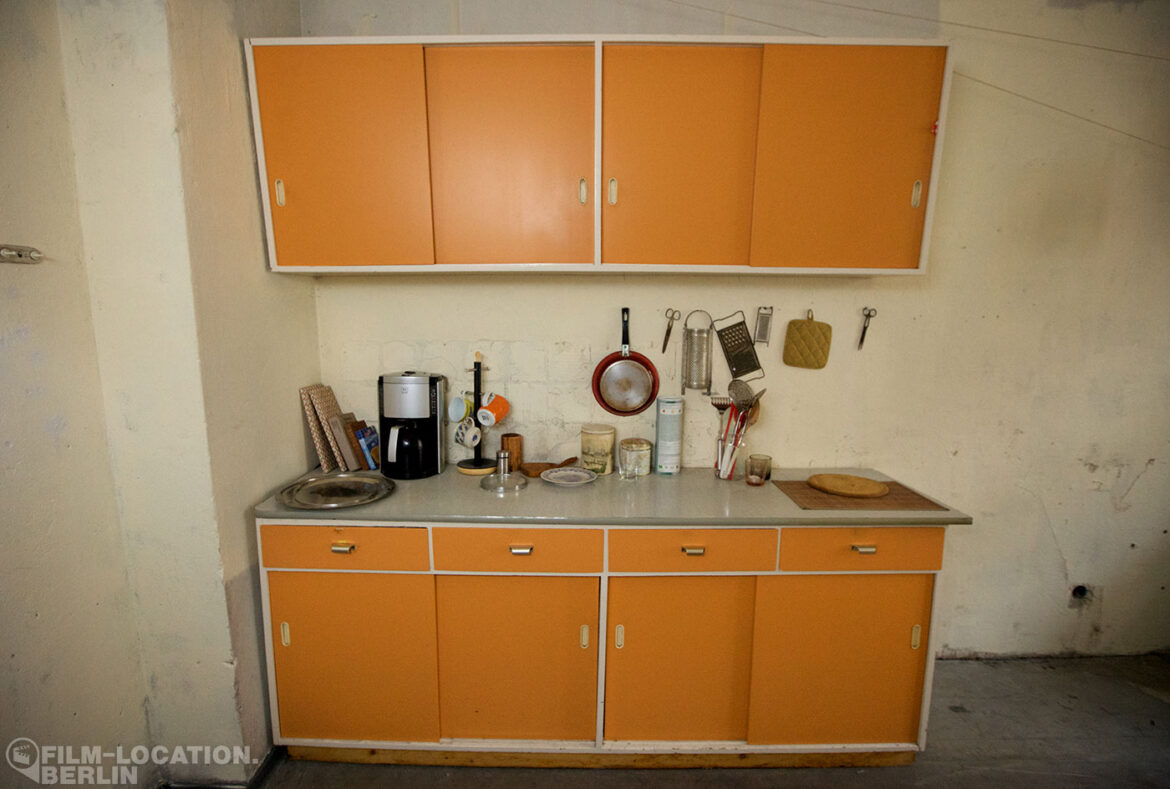 This simple, functionally furnished kitchen in 1960s style recalls the charm of everyday life in East Berlin. A standout feature is the striking orange sideboard, which, together with the matching hanging cupboard, adds a nostalgic touch. The room is furnished with a dining table and two chairs, along with an old stove and a retro refrigerator. With loving details and classic kitchen appliances, the room has its own authentic character.